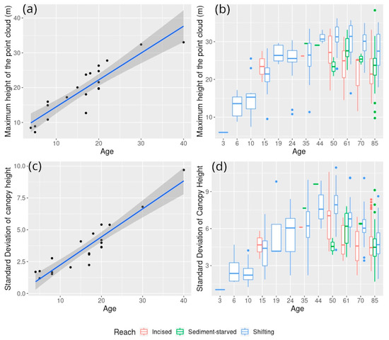 We explored these two issues on the Ain River, France, where combined airborne and field data exist within a well-established geomorphic framework [61]. In our analysis, we first took a look at the topographic, structural, and spectral information for the selected forestry plots. Two sites were selected because they have good hydrological connectivity, while also featuring a mosaic of ages with plots ranging from three to forty years old (y.o.). Other sites were selected based on previous studies featuring mature riparian forest of a similar age, but on a gradient of hydrological connectivity due to channel changes (e.g., incised vs. stable or slightly aggrading channels).