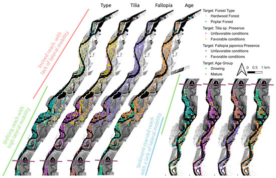 The classification targeting age groups attempted to distinguish between the growing forest and mature forest patches. Growing forest patches are likely to be located in areas where lateral mobility occurs and leads to forest rejuvenation, whereas mature patches are likely to be located on either well-connected areas of the river that have not yet been eroded or along reaches impacted by sediment starvation. For practical purposes, we distinguished between the “growing” and “mature” types of forest patches by referring to the age at which plot composition shifts towards post-pioneer and vegetation height (therefore, the height of poplar trees in the plot) reaches its maximum. This results in the “growing” class targeting the parts of the riparian forest that are of interest for the local stakeholders, due to having higher patrimonial value.