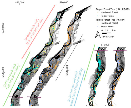 Studies coupling hyperspectral data with LiDAR data in riparian environments are rare. In [56], hyperspectral and LiDAR data were analyzed using machine learning techniques to monitor natural grasslands in lowland river valleys for habitat protection and conservation purposes. A similar methodology was then applied to identify herbaceous and shrub species on the Vistula River, Poland [57]. A few other studies were able to identify tree species or to map the health of individual trees in mature forest floodplains [58,59,60]. However, the forests analyzed in these studies mostly featured hardwood and evergreen species belonging to later successional stages and were not subject to the mosaics of age and hydrological connectivity that can be found in riparian corridors.