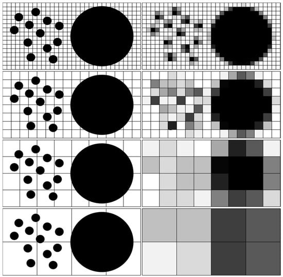 These images, together with the main source image, were the basis for further analysis. Individual pixel sizes were selected to correspond to the typical resolutions of satellite images: