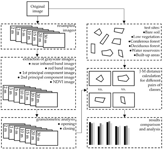 Two primary objectives of the study were identified. The first objective was to determine the impact of the spatial resolution of an image on the effectiveness of texture analysis for distinguishing some selected (basic) land cover classes. For this purpose, a very high resolution test image was taken and then its resolution was gradually reduced, creating subsequent test images. The second objective of the study was to determine whether, and in what manner, the type of a source image is significant for the effectiveness of texture analysis. Texture, as a spatial feature, is to some extent independent of the spectral features of objects, but it seems justified to put forward a thesis that in some images, e.g., spectral bands or certain products of image processing (spectral indicators, images of principal components, etc.), certain texture features may be more visible than in others. Determining the impact of the source image type on the effectiveness of texture analysis was the second objective of the present study. The scheme of the research methodology is presented in Figure 2.