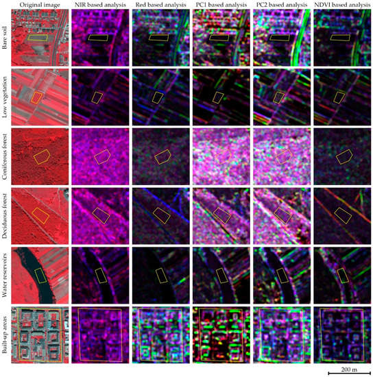 The rationale for the above selection was to present diverse images/products that can be obtained from multispectral data and was based on the experience gained from previous studies [14]. These studies had shown i.a. high effectiveness of texture analysis based on NIR images, the images that present high contrast between the areas covered with vegetation and other areas, with very dark shadows which are the reason for a distinct texture of the classes characterized by the occurrence of tall elements.