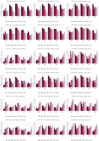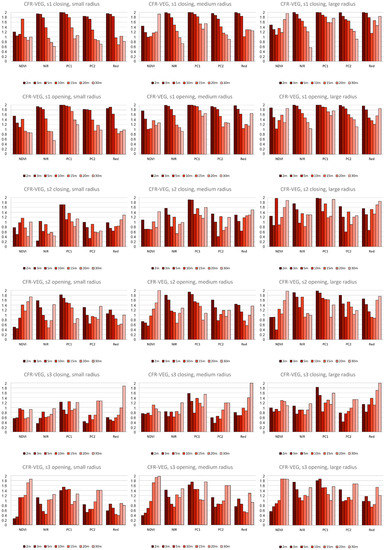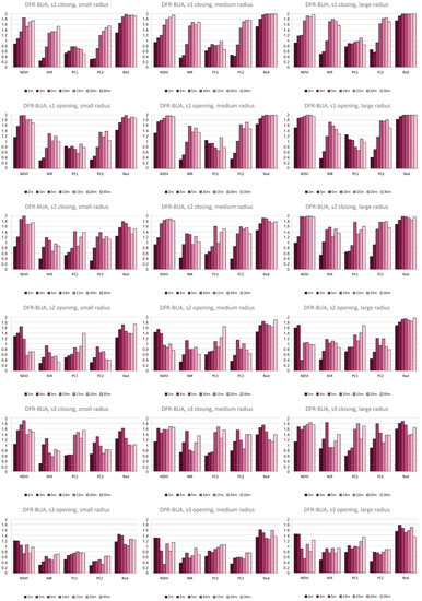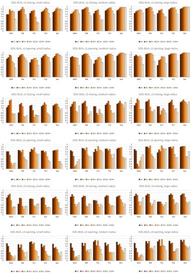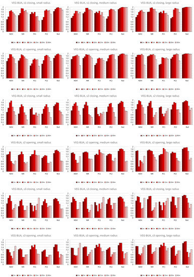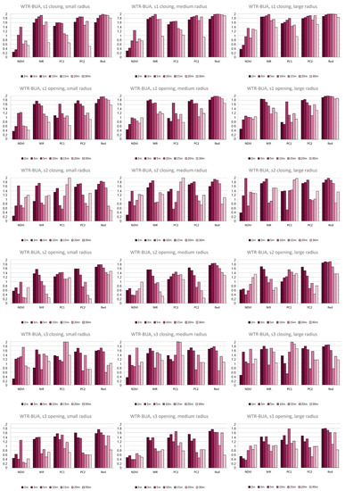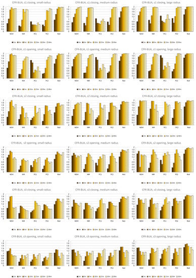 For the analysis based on closing, for images with the highest resolution and the index 2 (s2—size of the analyzed texture grain) worse results were obtained than for the analysis based on opening. Interestingly, this applies mainly to the analysis performed on NDVI, NIR and PC1. Considering that the operation based on opening analyzes the presence of bright texture elements, it can be concluded that this effect is related to the presence of bright objects (e.g., buildings, pavements, squares), allowing for a better distinction between the textures of both classes. It should be pointed out that in the discussed cases the effects obtained thanks to the opening—although better—are not fully satisfactory.