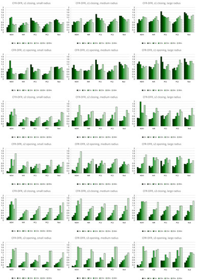 Again, the difference between the results obtained for the opening and closing for the analysis with the index s2 (the average size of the structuring element) can be seen. This time, however, better results were obtained based on closing. It should be noted, however, that we are dealing here with two classes with a distinct texture—hence the apparently different nature of the important features of this texture that distinguish these classes. The greater importance of closure (an operation analyzing the presence of dark texture elements) may indicate the importance of shadows of own forest areas.