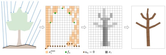 Our approach to tree reconstruction from lidar data is to interpolate the lidar samples and the ground with an efficient distribution of woody material. This optimal material distribution problem is what is solved using topology optimisation. We now describe this standard topology optimisation formulation, followed by our set of adaptations for application to tree reconstruction in Section 3.2, Section 3.3, Section 3.4, Section 3.5 and Section 3.6. The main stages of this process are depicted in Figure 2.