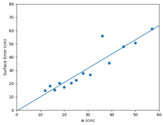 The sensitivity of the reconstructed BSG surface error to the voxel size w is presented in Figure 5. As one would expect, the error increases roughly in proportion to the voxel size. There is a single outlier due to the BSG reconstruction phase missing a portion of one tree at the large voxel size of 36 cm. Other than this, the relationship is almost linear, with a best fit line at cm. There is an apparent slight levelling off at the smallest voxel sizes, which is expected behaviour when the voxel size becomes too small to be well-represented by lidar points. The levelling appears to occur from 20 cm wide voxels and lower, which corresponds to an average of 8 lidar points per occupied voxel.