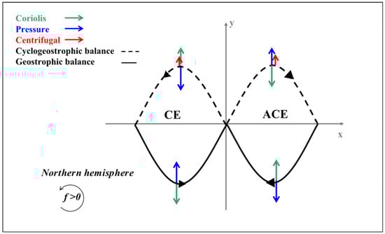Douglas and Richman [] compared the azimuthal velocities of some intense mesoscale eddies in the Gulf Stream using altimeter and numerical model data. They proposed that a more complete statistical description, including nonlinear terms, can be obtained from observation data by properly considering the dynamics of eddies. Uchida et al. [] corrected the sea surface velocity derived from satellite altimeters by taking into account the ageostrophic component caused by the curvature of the Kuroshio. The curvature effect of streamlines corrects the geostrophic balance between the pressure gradient force and Coriolis force to the balance between pressure, Coriolis and centrifugal forces (Figure 1). This balanced state is called “cyclogeostrophic balance,” and the current under this balance is called a “cyclogeostrophic current” []. A cyclogeostrophic current is a kind of approximate geostrophic current, which is the correction of centrifugal acceleration to the current along the curved streamline. This correction is very important in strong eddies and eddies with Rossby numbers (Ro) close to 1. Small Ro numbers indicate that the motion is significantly affected by Coriolis force, while large Ro numbers indicate that the motion is dominated by inertial force (centrifugal force) [].