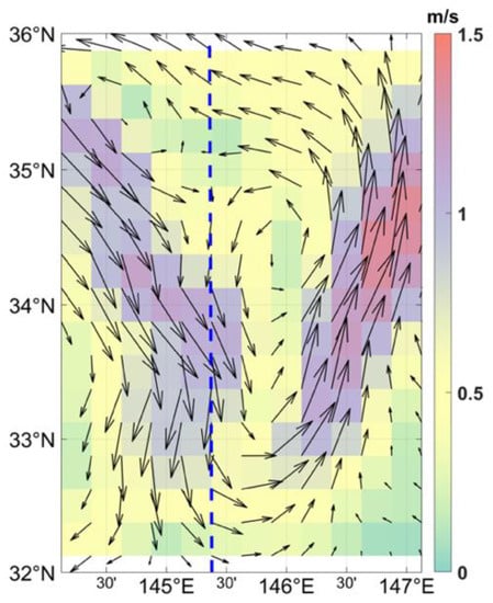 According to the results in Figure 9 and the generation mechanism of eddies in the Kuroshio Extension region, the difference in the cyclogeostrophic correction may be related to the relative vorticity of the sea surface current. Neglecting the β-effect and the vertical stretching and extrusion, the relative vorticity is conserved []: