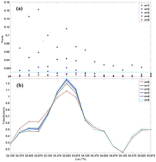 For meanders, in order to determine the convergence scheme of the iterative algorithm, this study tests the velocity of a curved section of meander located in the Kuroshio derived by satellite altimeter on 12 August 1998. First, the local norm is set as 0.01 and calculated on the central grid point and the eight nearest grid points. Second, the velocities in the curved jet section, which are located on the grid point with longitude 145.375°E and latitudes 32.125°N to 35.875°N (blue dotted line in Figure 2) are corrected using the iterative algorithm. The maximum and minimum velocity of grid points selected for testing is 1.2 and 0.1 m/s, respectively. The convergence is slower after five steps []. When the initial geostrophic speed is large, the scheme converges quickly after four iterations, as shown in Figure 3. Figure 3a shows that the norm value of the tested points with large velocity is generally less than 0.01 after the third iteration, the norm value of the points with small velocity is less than 0.01 after the first iteration, and the norm value of some points is less than 0.01 in the first iteration. Comparing the geostrophic velocity with the velocity after each iteration (Figure 3b), it is found that the cyclogeostrophic correction of the velocity at grid points with large velocity or large curvature is significant, and the cyclogeostrophic velocity is greater than the geostrophic velocity. Combined with the variation characteristics of velocity and norm, the grid resolution of the altimeter merged data is 1/4° × 1/4°. To ensure the accuracy of the correction, the judgment condition of convergence is determined as stop iterative calculation when the local norm value is less than 0.01 or starts to increase. In addition, it should be noted that for grid points with small geostrophic velocities, the number of iteration steps is only one.