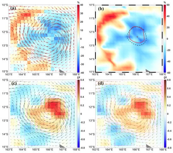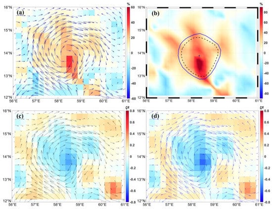 where u is the zonal velocity and v is the meridional velocity. This iterative algorithm may diverge after a few steps []. According to Penven et al. [] and Ioannou et al. [], for intense mesoscale eddies, the iteration occurs for each grid point, and the criterion for stopping iteration is when is 0.01.
