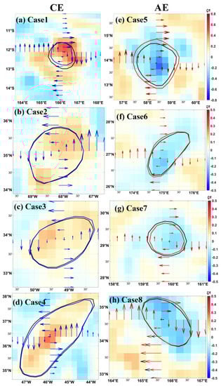 According to the difference analysis of the kinematic characteristics of the above two eddies, the correction has a certain impact on the shape of the eddy. Eight eddies with different shapes were randomly selected (four cyclones and four anticyclones), as shown in Figure 6. For the elliptical eddy, the effect of cyclogeostrophic correction on the eddy boundary was not significant (Figure 6b–d,f). For the eddy with high roundness, the cyclogeostrophic correction had a significant effect on the eddy boundary (Figure 6a,e,g).