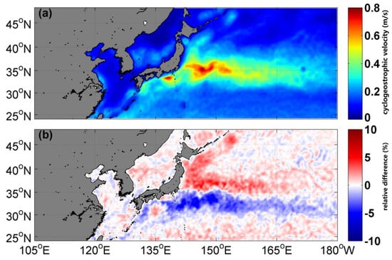 (a) Cyclogeostrophic average eddy velocity (m/s) and (b) relative difference between the multi-year (1998–2012) average velocity of the cyclogeostrophic current and the geostrophic current in the Kuroshio Extension region.