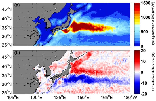 (a) Cyclogeostrophic average eddy kinetic energy and (b) relative difference between the multi-year (1998–2012) averages of the eddy kinetic energy of the cyclogeostrophic current and the geostrophic current in the Kuroshio Extension region.