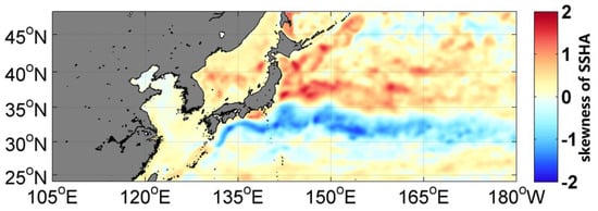 By correcting the Kuroshio Current velocities derived from altimeters, the difference between the corrected and geostrophic current fields can be analyzed. The results show that the correction has a significant impact on the change in EKE. The difference between the cyclogeostrophic current and the initial surface current derived from altimeters on both sides of the Kuroshio main axis is bipolar. Figure 9 shows the skewness distribution (1998–2012) of the sea surface height anomaly (SSHA) in the Kuroshio Extension region. The spatial pattern resembles the difference of velocity and EKE between cyclogeostrophic current and initial surface current, in which the positive SSHA are more probable than negative ones north of the Kuroshio Extension axis and the negative SSHA are more probable than positive ones south of the Kuroshio Extension axis. The dynamic structure of ocean eddies and jets may be the reason for the skewness distribution of SSHA []. The movement of an eddy causes local convergence and divergence of sea water. Ji et al. [] pointed out that in the Kuroshio Extension, eddies are generated by the unstable meandering path. According to this eddy generation mechanism, more cyclonic (anticyclonic) eddies with long lifespans are in the south (north) of 35°N. The cyclonic eddy presents a negative SSHA, in which the central sea surface height is lower than the surrounding region. The SSHA of the anticyclonic eddy is positive, meaning that its center is higher than the surrounding region [].