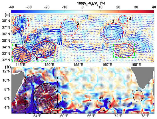 Spatial distribution of the relative difference between the cyclogeostrophic and the geostrophic velocities at different latitudes, different velocities, and different shapes, where (a) is the mid-latitudes of the Pacific Ocean on 5 May 2009 and (b) is the low-latitudes of the Indian Ocean on 12 August 1998. The vectors represent the cyclogeostrophic velocities. The number represents the eddy code used for the test.