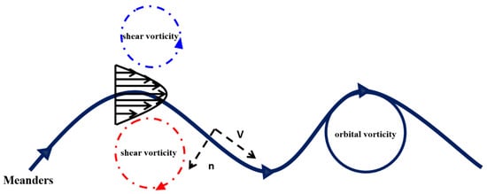 Schematic diagram of the shear vorticity and orbital vorticity of the meander.