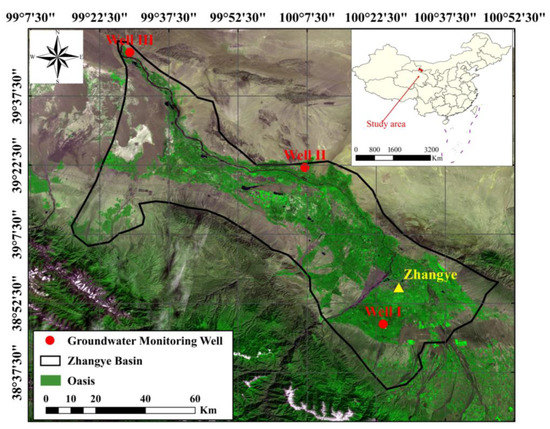 The Zhangye Basin (105°19′–106°44′E, 38°42′–39°47′N), which has an area of 5500 km2 and a population of 1.24 × 106, is located in the middle reach of the Heihe River (Figure 1). As an indispensable node that connects China and central Asia, the Zhangye Basin occupies a significant position in the Silk Road Economic Belt. The climate in the Zhangye Basin is arid and continental with an annual temperature of 6–8 °C and a mean potential evaporation of 2002.5 mm. The annual precipitation is about 150 mm with approximately 80% concentrated in June to September [34].