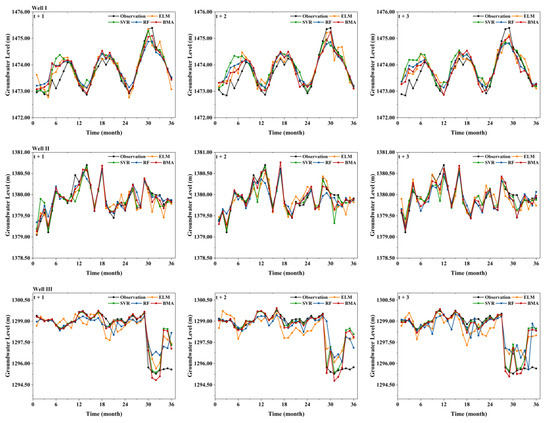 It is noteworthy that although the three single models achieved a good performance, none of them consistently outperformed the others. For Wells I and II, the RF achieved the best performance in the 1-, 2-, and 3-month-ahead GWL predictions. Similarly, SVR was considered to be the best model for Well III. This was mainly because the differences in model parameters and structures introduced a great deal of uncertainty to the modeling process [24,26]. Generally, the RF model showed a superior performance with a higher R value of 0.931, 0.899, and 0.870 for the 1-, 2-, and 3-month-ahead GWL prediction on average, respectively; followed by the SVR and ELM models. The outperformance of the RF over the other machine learning approaches (i.e., SVR and ELM) in the GWL predictions was expected because it is an ensemble-based method that often performed better than other machine learning methods in previous studies [13,66].