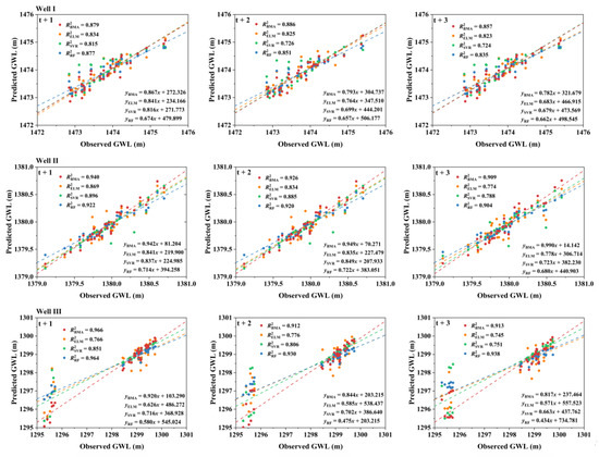 In addition, the outstanding performance of the BMA over the others was consistent among the three wells. Taking Well II (the well with the best predicting performance) as an example, the best-performing SVR model obtained an R of 0.900, 0.908, and 0.876 for the 1-, 2-, and 3-month-ahead predictions; while the R value of the BMA increased to 0.954, 0.956, and 0.906, respectively. The BMA yielded an NS and RMSE of 0.909, 0.912, and 0.810 and 0.111 m, 0.100 m, and 0.141 m for the 1-, 2-, and 3-month-ahead predictions, respectively; in contrast to the corresponding values of 0.805, 0.810, and 0.749 and 0.162 m, 0.147 m, and 0.161m for the SVR, respectively. That is, the ensemble BMA model provided more accurate GWL predictions.