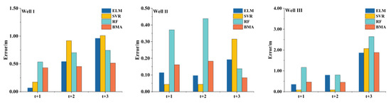 The errors of the lowest GWL predictions for the ELM, SVR, RF, and BMA models for Wells I, II, and III at 1-, 2-, and 3-month-ahead prediction horizons in the testing period.
