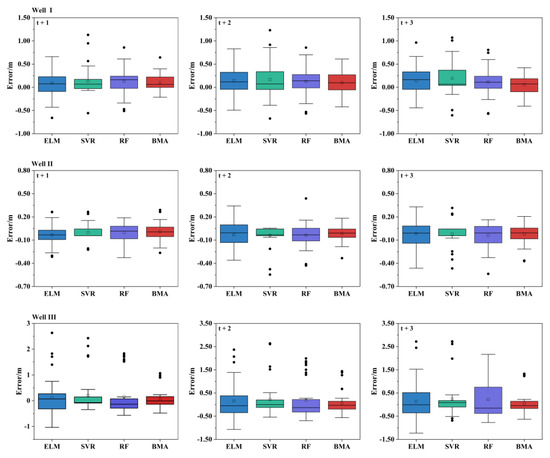 The error box–whisker plots were further developed to present the error characteristics (Figure 5). Overall, the error of the BMA and the SVR was relatively smaller for 1 to 3 month ahead predicting horizons. However, the error median of the BMA model was much closer to 0 than that of the SVR model, which indicated the more concentrated error distribution of the BMA model. The results indicated the superiority of the BMA model over the single models in multi-time-ahead GWL prediction.