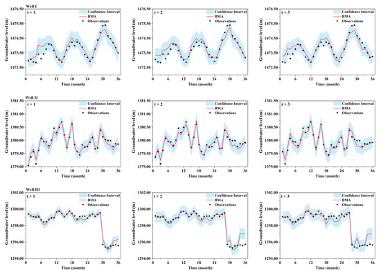 Furthermore, Table 4 shows the uncertainty metrics of the BMA model for the three selected wells in both the training and testing periods. Recall that the model would have perfect reliability if the CR equals the confidence level; if the CR values are similar, then the one with a lower B has a better reliability. What could be derived from Table 4 was that the uncertainty analysis results of the 1-, 2-, and 3-month-ahead GWL predictions for the three wells were not always identical according to the CR and B values. It seemed that it was very difficult to derive a balanced low CR as well as high B values, which also was encountered by other researchers [70,71]. Regardless of the CR, the B and D values increased with the increase in the lead time in most circumstances, which was consistent with results of the statistical metrics. The results indicated that the prediction uncertainty of the BMA model accumulated with the increase in the lead time.