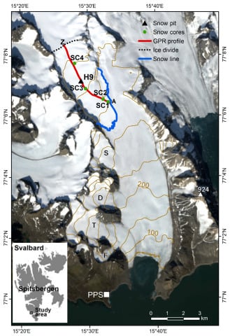 Snow cover plays a vital role in the functioning of the glacial system. A thermal conductivity up to 20 times lower than ice [] and albedo reaching 90% [,,] make snow cover an efficient insulator, determining a glacier’s heat balance and the thermal properties of the underlying ice layers. Snow is the material composing a glacier, which makes it a key component of glacier mass balance [,] and the changes in its geometry. After deposition, snow cover undergoes a process of metamorphism, changing its physical properties in time and space [,]. This process depends on climatic conditions, the rate of accumulation, and the nature of ablation. The stratigraphic features of snow cover are the result of complex atmospheric, surface [], and internal processes (water and water vapor migration, heat transfer, densification) [,,,] that determine the characteristics of the snowpack (grain size, density, presence of ice layers) and its evolution [,]. Due to the changing nature of the above conditions, the snowpack is made up of distinct layers of snow that differ by at least one physical feature. Furthermore, the snowpack is a freshwater reservoir [] that through melting initiates supraglacial, englacial, and subglacial drainage [,], which influences basal sliding as well as transporting impurities [,,] and mineral substances [,].