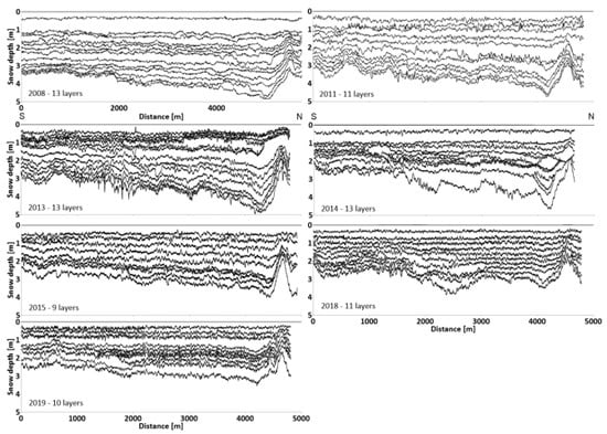 The procedure for assigning the snow properties observed in the snow pit to the GPR profile layers was generally not in doubt. The 2014 season was the only season in which a layer was found that was not identified in the snow pit, situated below the ice divide in the area with the highest HS (see Figure 4 and Figure 6, Figure 7 and Figure 8). It was 411 m in length and had an average thickness of 0.24 m. In the vast majority of other cases, the layers were continuous (Figure 2). This allowed us to assume that the H9 snow pit was representative of the entire centerline of the Hansbreen accumulation zone. Nevertheless, an additional snow pit could provide positive confirmation of the validity of the profiles.