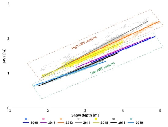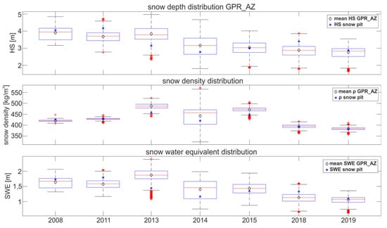 Similar to HS, the shift in both mean and median density and SWE between seasons 2013 and 2014 was clearly visible (Figure 3). In the series of snow densities analyzed, the highest variability was recorded in 2014; however, the median density for this season was a bit below the median density for the seasons 2013 and 2015 (Figure 3). The difference in average snow density between 2008 and 2019 for GPR_AZ was 9% (420 kg m−3 and 384 kg m−3, respectively; 6 kg m−3 per year). The highest value, 487 kg m−3 was in 2013. The non-parametric modified Mann–Kendall test [] showed no statistically significant trend in 2008–2019 (α = 0.05). The Sen’s slope was −16.6 for density for the snow pit and −37.8 for GPR_AZ.