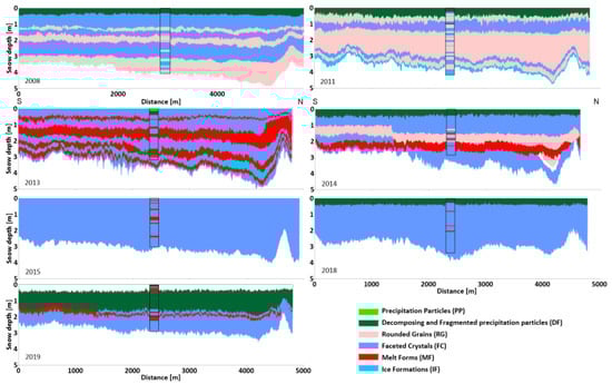 The snow profiles shown in Figure 2, Figure 4, Figure 5, Figure 6, Figure 7 and Figure 8 represent the snow cover over 11 years at the end of the accumulation season. The sequence of layers, in most cases, showed a similar pattern.
