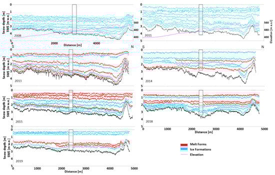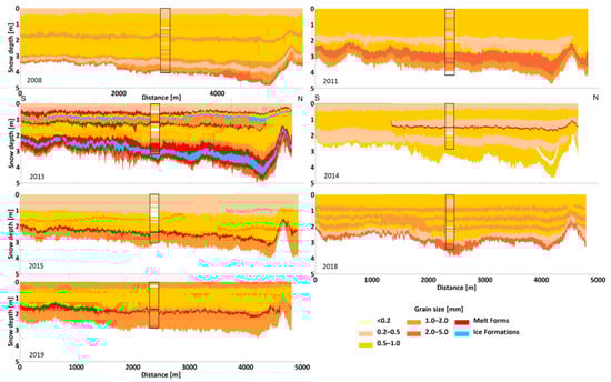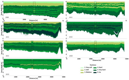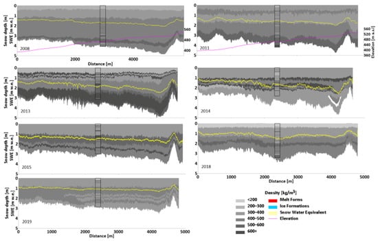 The properties of the snow cover were examined in seven seasons between 2008 and 2019 (Table 2). The processed data are presented in three groups: (1) snow cover properties obtained by analyzing snow pit data, (2) internal structure of snow cover derived from the GPR survey and (3) extrapolated results of the spatial variability based on GPR profiles. The summary of the snow pit results and extrapolation results is presented in Table 2 and in Figures 4–9. The snow structure obtained from the snow pits illustrated in Figures 4–8 is marked as black-framed rectangles.