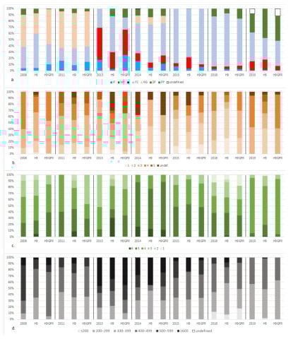 Percentage contribution of grain shape (a), size (b), hardness (c) and density (d) classes in 2008–2019. Bars marked H9 show the percentage of individual snow parameters in the snow pit. H9GPR bars represent the average value of individual parameters from 40 traces up and down from the location of the snow pit.