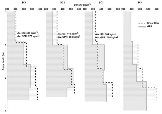 The overall bulk snow density based on GPR differed from that calculated for snow cores by less than 10% (Figure 10). In the case of SC1 and SC2, the GPR density was lower by 9.6% and 3.9%, respectively, while at the SC3 site, the GPR density was higher by 2.6%. In the case of SC4, such verification was impossible due to the lack of snow density in the upper 1 m long core segment. The snow density calculated for the individual snow core segments was also compared with the average density of the respective snow layers based on GPR, obtaining a correlation coefficient of r = 0.8. On average, the snow density in the snow core segments was 8.3% higher than based on the GPR, which resulted from the inability to identify all HLs with higher density in the GPR profile due to the vertical resolution of the sounding. The greatest difference in snow core–GPR density was noted for the second segment from the top of SC3 (snow density based on GPR was 24.8% higher than in the snow core segment) and the deepest segment of SC4 (snow density based on GPR was lower by 19.2% than in the snow core segment). It is worth noting that SC4 was the farthest from the GPR profile, which also explains the lower consistency of snow characteristics than those recorded at other coring sites. The density pattern in the snow cores and the accompanying GPR profiles was similar and tended to increase with depth. Considering that the measurement of the volume and weight of snow core segments was subject to an error that may have reached several percent, the results obtained in comparing the density in snow cores and the nearest fragment of the GPR should be considered satisfactory.