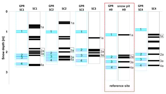 HLs recognized in snow cores, snow pit H9, and the nearest sections of GPR profile. A total of 1–4—HLs identified in the GPR profile; 1a–4a—HLs identified in snow cores corresponding to layers 1–4. Reference site H9 (HLs in the snow pit and corresponding GPR section is marked with a red dotted rectangle). Location of the GPR profile and snow cores (SC1, SC2, SC3, SC4) is presented on Figure 1.