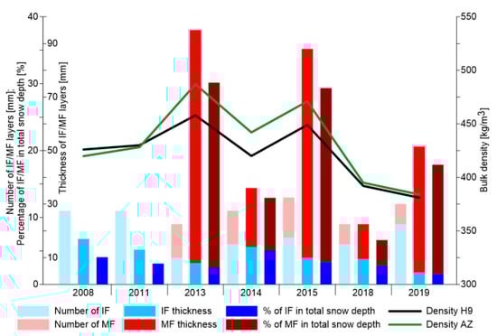 Grain shape—all types of grains excluding Surface Hoar were observed during direct observations in snow pits (Figure 4—see the vertical bar in the middle of the profiles). In the period analyzed, the years 2011, 2013, and 2014 had the most diverse range of types of snow grains: five, seven, and six types were distinguished, respectively, while in the remaining years, only four types of grains were distinguished. In 2008 and 2011 no MF were observed. In these years, no long-term thaws were observed at PPS Hornsund during the snow accumulation period (January–April) (1 day in 2008, 3 days in 2011) in contrast to the other years (e.g., 12 such days were observed in 2015). Moreover, in 2008, 2011, and 2014, Rounded Grains (RG) were observed in the snow pits, which did not occur in the other years. Along with the greater amount of meltwater, the number of pores decreased and the density increased, which is an obstacle in the formation of RG grains. Depth Hoar (DH) grains were observed as a second minority form in individual layers and in this paper, we did not consider such specific details. The IF and MF layers accounted for 14% (4% and 10%, respectively) of the snow structure in the snow pits. In 2008–2019, the number of IF layers varied between 11 (2008, 2011) and 9 (2019), with a minimum of four layers in 2013 (Figure 5—see the vertical bar in the middle of the profiles). At the same time, the total thickness of the IF layers in the seasons concerned showed a decreasing trend of 1.04 cm per decade (in 2008: 17cm of IF; in 2019: 4.5cm of IF). The number of MF layers ranged between 6 and 3. The percentage of MF layers in total HS varied between 28% (87 cm) in 2013 and 16% in 2019 (19 cm), with a minimum value of 4% in 2018 (13 cm).