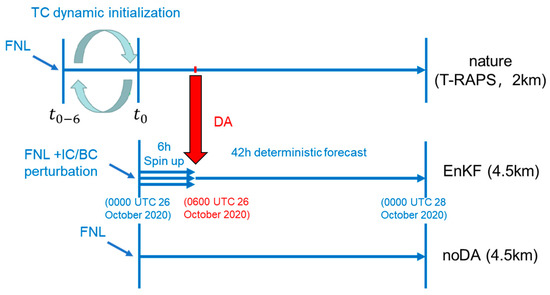 - The initial and boundary condition of the nature run comes from the NCEP GFS forecast (with a resolution) that started at 18:00 UTC on 25 October 2020, whereas the NCEP FNL (with a resolution) is adopted in the EnKF/noDA experiment, and its initial time is 6 h later than the nature run;