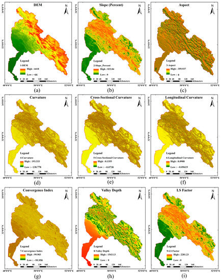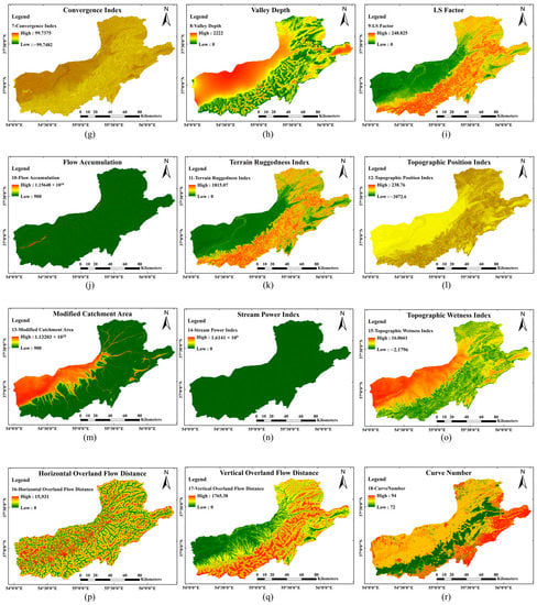 The produced flood conditioning factors for FSM in the Gruganrud basin. (a) DEM, (b) Slope, (c) Aspect, (d) Curvature, (e) Cross-Sectional Curvature, (f) Longitudinal Curvature, (g) Convergence Index, (h) Valley Depth, (i) LS factor, (j) Flow Accumulation, (k) Terrain Ruggedness, (l) Topographic Position Index, (m) Modified Catchment Area, (n) Stream Power Index, (o) Topographic Wetness Index, (p) Horizontal Overland Flow Distance, (q) Vertical Overland Flow Distance, (r) Curve Number, (s) Land Use/Land Cover Map, (t) Normalized Vegetation Index, and (u) Modified Fournier Index.