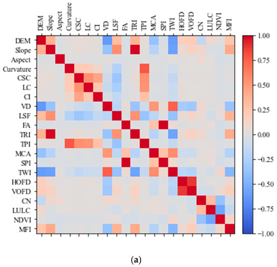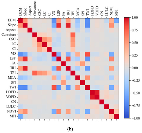 This study used 21 flood conditioning factors for FSM. Figure 6 shows the correlation between variables based on the Pearson correlation Coefficient (PCC) for the Karun and Gorganrud basins. Based on the results, the correlation between the independent variables was low (under 0.5). However, the correlation between the dependent variables (e.g., TRI and Slope factors) was more than 0.7.