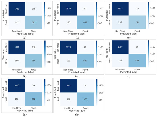 It is worth noting that there is a tradeoff between flooded and non-flooded classification using machine learning models. Based on the presented confusion matrices in Figure 9 and Figure 12, some differences for the flooded and non-flooded classes were observed. For instance, a comparison between Figure 12e,h showed that the performance of the LightGBM and CFM models was not similar. Thus, the proposed method had a high level of effectiveness in both flooded and non-flooded classes.