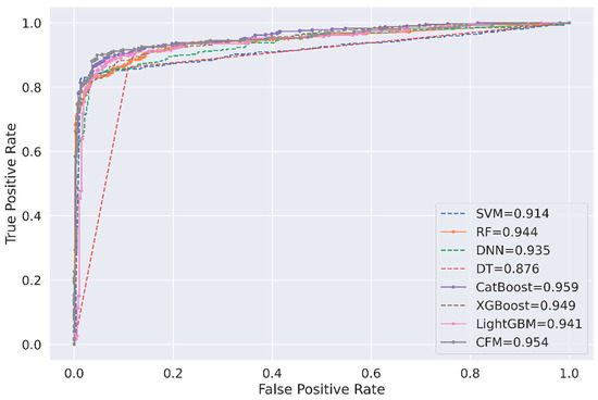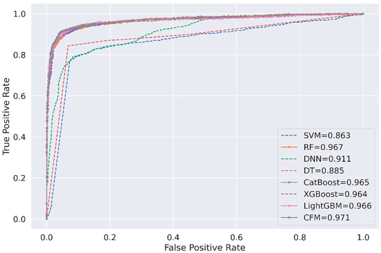 A comparison of the ROC curves and AUC values of different FSM models using the test dataset. Support Vector Machine (SVM), Random Forest (RF), Deep Neural Network (DNN), Decision Tree (DT), Light Gradient Boosting Machine (LightGBM), Categorical Boosting (CatBoost), Extreme Gradient Boosting (XGBoost), and Cascade Forest Model (CFM).