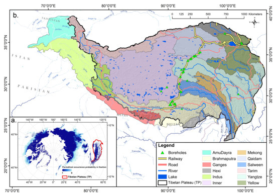 Study area. (a). The distribution of permafrost for the Northern Hemisphere [3], where the Tibetan Plateau (TP) is marked with a red margin. (b). The extents of TP and major river basins originating from the TP [35]. Boreholes in the map was used to measure ground temperatures along the Qinghai–Tibet railway and highway from Golmud, Qinghai Province to Lhasa, Tibet Autonomous Region, China. Redish lines of road networks indicate the national highways.