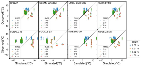 Comparison of simulated soil temperatures from eight ESMs and observed data at different depths for the TP.