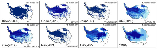 Spatial comparison of permafrost distribution from previous results and our results. The results of Brown et al. [39], Zou et al. [22], and Ran et al. [38] directly show the extent of spatial permafrost, while others represent the permafrost distribution using the possibility of permafrost coverage represented as shades of color [1,27,28,37].