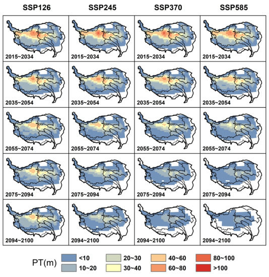 We calculated the permafrost thickness of TP from 2015 to 2100 and the average for every 20 years using the future data set of ESMs from CMIP6, including four different scenarios (SSP126, SSP245, SSP370, and SSP585). Figure 6 shows the spatial distribution of computed permafrost thickness. In the near future, permafrost thickness will have an apparent decreasing trend under the four scenarios. The minimum and maximum reductions in areal extents of permafrost thicker than 10 m will be reduced to 0.19 and 0.87 million km by 2100 under scenarios SSP126 and SSP585, respectively. The area of permafrost thicker than 30 m will reduce from 0.55 million km in 2014 to 0.18, 0.006, 0, and 0 million km in 2100 under scenarios SSP126, SSP245, SSP370, and SSP585, respectively.