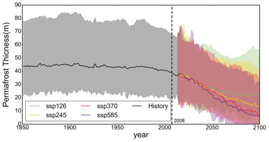 Figure 7 shows average variations in permafrost thickness between 1851 and 2100. The average permafrost thickness was 43.20 m during historical period of 1851–2014, and by 2100 it would be reduced to 22.17, 14.02, 7.07, and 5.67 m under scenarios SSP126, SSP245, SSP375, and SSP585, respectively. The time series of PT indicates a relatively stable permafrost during the historical period before 1990. However, it has entered a period of rapid permafrost degradation since 2008.
