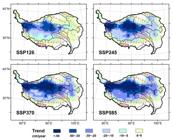 Spatial distribution of linearly regressed thinning trends in permafrost thickness across the Tibetan Plateau during 2015–2100 as model predicted under the four scenarios of SSP125, SSP245, SSP370, and SSP585.