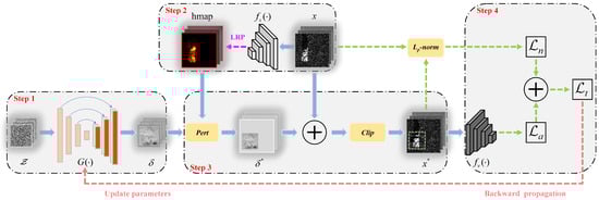 The framework of the Universal Local Adversarial Network (ULAN) is shown in Figure 2. To describe the training process of ULAN more clearly, we divide it into four steps. The first step uses a generator to learn the mapping from normal distribution noise into universal adversarial perturbations (UAPs). Next, the second step calculates the pixel-wise attention heatmaps of the surrogate model through layer-wise relevance propagation (LRP). Then, the third step utilizes UAPs and attention heatmaps to craft adversarial examples of SAR images. Finally, the fourth step computes the training loss and updates the generator’s parameters through backward propagation. Note that the victim model is a white box in the training phase, but in the testing phase it is a black box, and thus, we calculate the heatmap of the surrogate model as an alternative to the victim network’s heatmap. This chapter will introduce each of the above steps in detail.