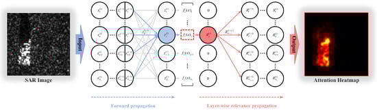 To analyze the relevance of each pixel in SAR images to the recognition results, we must obtain the DNN model’s attention heatmaps first. In this paper, we apply layer-wise relevance propagation (LRP) [], which takes as input the model’s logits outputs and outputs the pixel-wise attention heatmaps of the surrogate model . For an easy explanation, we suppose is an l-layer DNN without the softmax output layer. Figure 4 illustrates the network’s forward propagation and LRP.