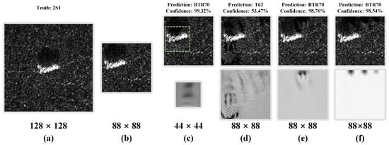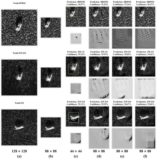 (a) The original SAR image in MSTAR. (b) The clean SAR image fed to the model. The first row shows the adversarial examples for non-targeted attacks, and the second row shows the UAPs generated by different methods, corresponding to ULAN (c), UAN (d), U-Net (e), and ResNet Generator (f), respectively. We list the prediction and confidence output by the victim model at the top of each adversarial example, and the bottom of the figure shows the sizes of the corresponding image and perturbation.