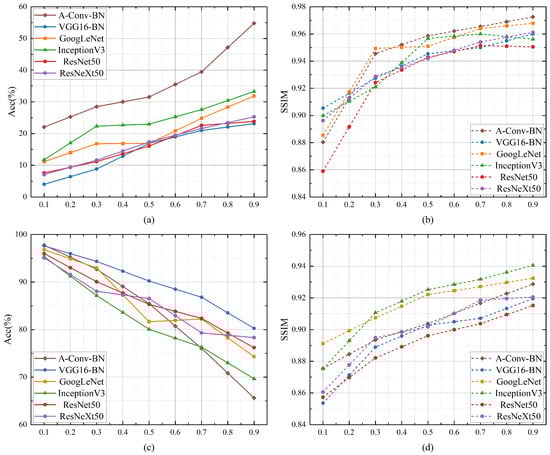 where and represent the true and target classes of the input data, k is the number of target classes, and is a discriminant function. In non-targeted attacks, the Acc metric reflects the probability that victim models correctly recognize adversarial examples. The lower the classification accuracy of the victim model on adversarial examples, the better the non-targeted attacks. In targeted attacks, the Acc metric represents the probability of victim models identifying adversarial examples as target classes. The higher the Acc metric, the stronger the targeted attacks. In conclusion, the non-targeted attack’s effectiveness is inversely proportional to the Acc metric, and the targeted attack’s effectiveness is proportional to this metric. Moreover, to verify the reliability of attacks, we also compared the confidence level of target classes before and after the attack.
